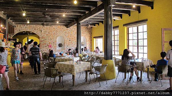 酒莊內部,鮮豔黃色牆面搭以木柱,南歐的鄉村風格。